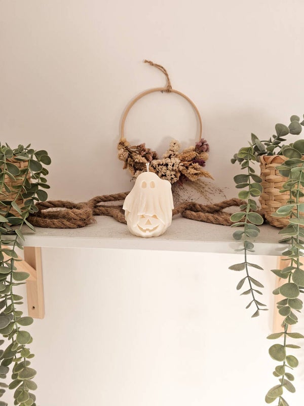 Découvrez notre bougie en forme de fantôme mignon tenant une citrouille sculptée. Fabriquée à la main, cette pièce unique est parfaite pour apporter une ambiance mystérieuse et chaleureuse à votre intérieur. Avec sa fragrance gourmande "Witch Brew", elle embaume votre espace de délicieux arômes chocolatés et pralinés, parfaits pour la saison d'Halloween. 🎃👻